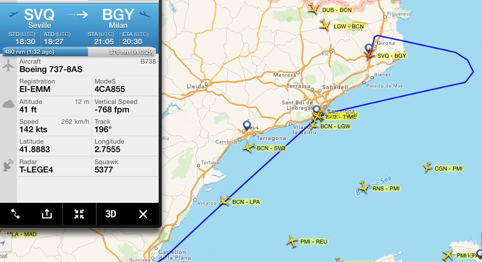 Vuelo Sevilla-Milán desviado a Girona por urgencia médica a bordo. Aterrizado sin novedad.