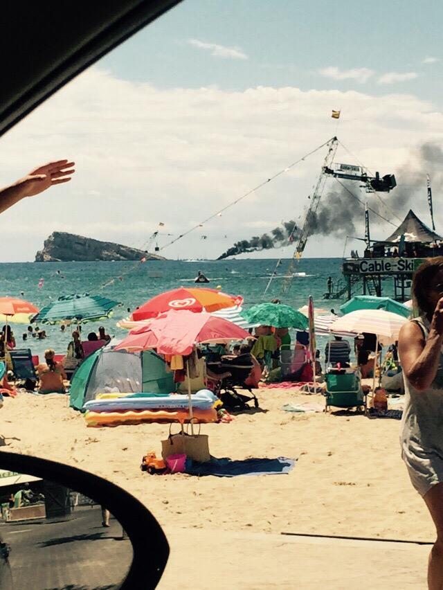Cruz Roja en playa Benidorm apaga fuego de una embarcación. Los tripulantes en tierra son atendidos en la ambulancia