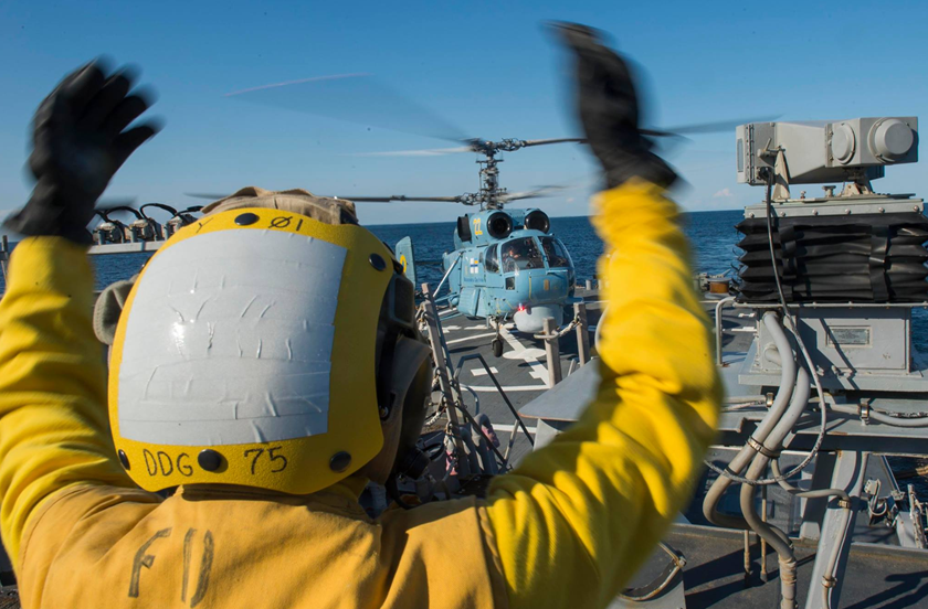 El USS Donald Cook realiza operaciones de vuelo con helicóptero KA-27 ucraniano durante el ejercicio #SeaBreeze2015