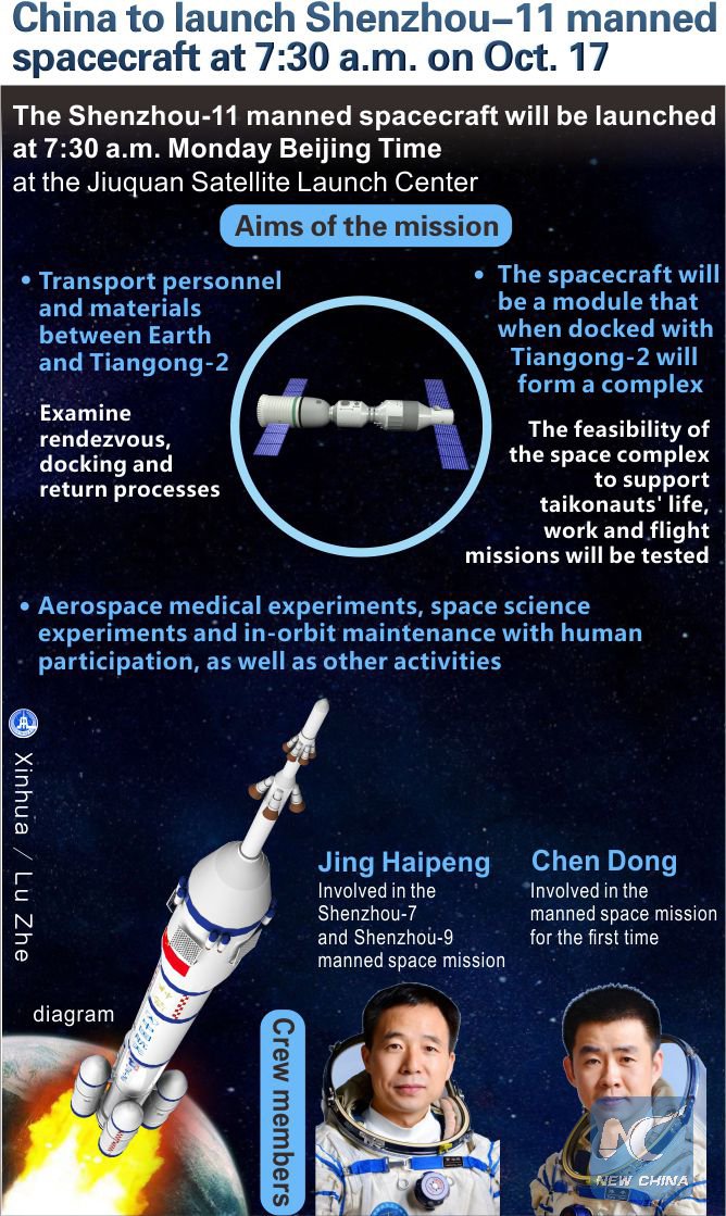 China's #Shenzhou-11 manned spacecraft will be launched at 7:30 a.m. Monday Beijing Time at the Jiuquan Satellite Launch Center