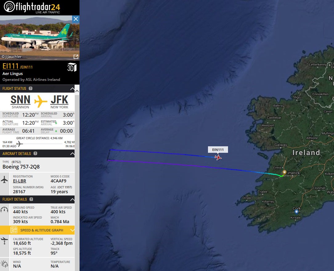 AirLLingus Shannon-New York JFK (757 EI-LBR) is returning to SNN. Reason not yet known. Frequency 121.500