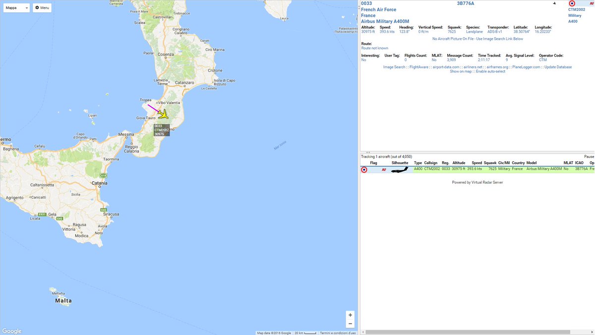 French Air Force Airbus Military A400M (0033) will leave in few minutes Italian airspace near Calabria, heading 123°