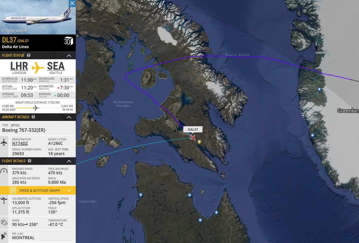 Delta DL37 LHR-SEA (767 N174DZ) is diverting to Iqaluit w/ medical emergency. ETD 1830UTC | via http://delta.com, @Satcom_Guru Frequency 121.500