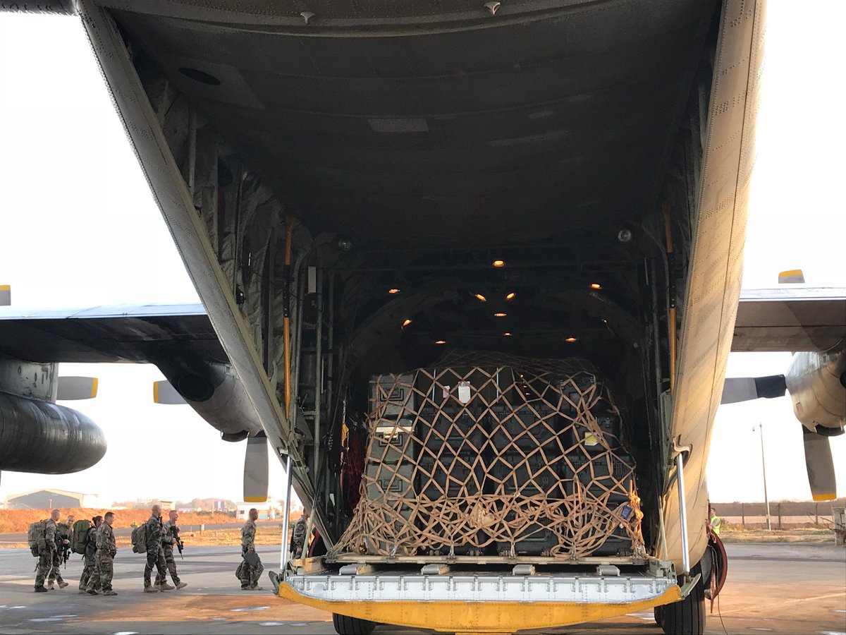 La actividad no cesa en el DestacamentoMarfil del EjercitoAire MOPS en su base de Dakar carga preparada en el T10 para una nueva misión de aerotransporte en el Sahel